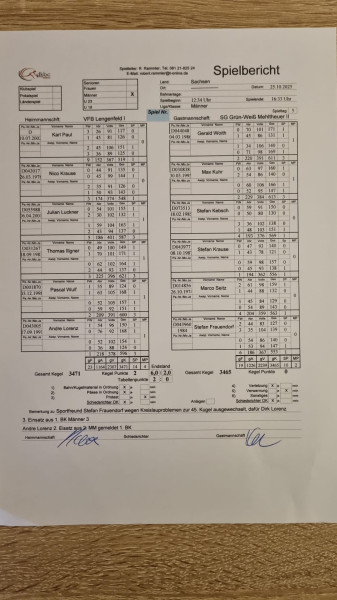 Es stand Topspiel drauf, es war Topspiel drin. Die Tabellenführung wurde an den VfB Lengenfeld 1908 abgegeben. Auch wenn es für die Mehltheuer maximal Punkte für den Busfahrer gab, konnten sie erneut ihre bestechende Leistung unter Beweis stellen. Mit dem dritten Spiel über 3.450 Holz ist in dieser Saison noch einiges zu holen. Die Auswärtsspielserie ist damit vorerst beendet. Am 08.11. darf man auf heimischem Terrain die Spieler des SV RW Treuen begrüßen. Die Treuener sind derzeit auf dem vorletzten Platz des Gesamtklassements – ein Gegner, der in den letzten Jahren häufig für Kopfzerbrechen gesorgt hat. Jetzt heißt es, Kräfte zu mobilisieren, um schnell wieder an die Tabellenspitze zurückzukehren. Foto zum Artikel  |